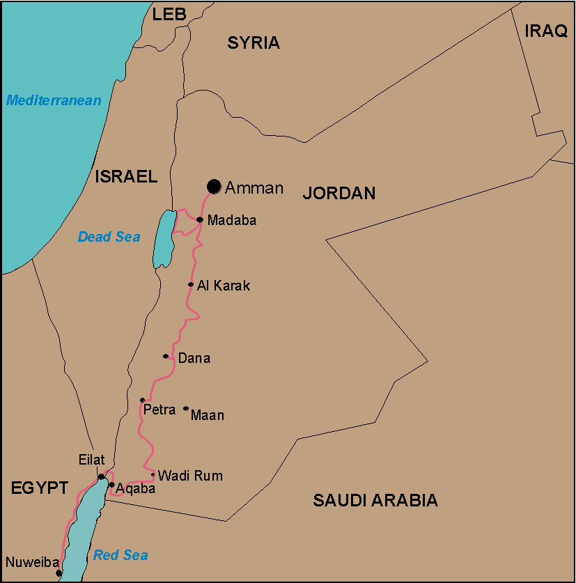 We followed King´s Highway from Madaba to Petra. The King´s Highway ends at the junction with the Desert Highway from Amman to Aqaba. From Wadi Rum we took the back roads through the desert to Aqaba and crossed the border to Israel in Eilat. From Eilat we cycled to Taba in Egypt and Nuweiba. From here we took the ferry back to Aqaba and went by bus back to Amman.