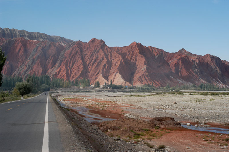 Nach fünf Tagen in Kashgar und dem überwältigenden Sonntagsmarkt geht es auf der Südroute der Seidenstraße am Rand der Taklamakan in Richtung Osten nach Khargilik. Zwei Tage lang zieht sich die Südliche Seidenstraße über 280 km relativ einfach und eben dahin. Leider herrscht viel Verkehr und tagsüber steigen die Temperaturen schnell auf 40°C und mehr. So machen wir viele Pausen im Schatten der Pappeln am Straßenrand und essen Melonen. 5 km nach Khargilik beginnt die chinesische Straße 219, die uns 2500 km über die Kunlun Berge, das Aksai Chin Plateau, hohe Pässe, die Ebenen Westtibets, Ali, vorbei am heiligen Berg Kailash und sandige Hochebenen nach Lhasa führen soll.