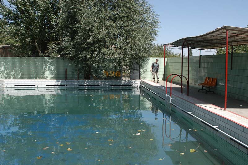 Anfangs geht es bei 42°C im Schatten (welcher Schatten?) stetig 3% bergauf. Es gibt interessantere Strecken mit dem Rad. Nach 30 km machen wir Pause im Schatten einer kleinen Mauer. Laut Roadbook ist es eine Zufahrt zu einer Militärbasis. Wir träumen von kühlem Wasser, frischem Obst und einem Schwimmbad. Nach 10 Minuten kommt ein Motorradfahrer vorbei und fragt, ob wir etwas zu Essen möchten. Ungläubig folgen wir ihm in die Anlage. Statt eines Armeelagers erwartet uns eine Sommerfrische für hohe Parteimitglieder. Die Besatzung langweilt sich. So werden wir mit frischem Obst, Straußeneiern und einem großen Schwimmbad überrascht. Nach drei Stunden im Wasser und unter schattigen Rebenlauben machen wir uns vollgefressen auf den Weiterweg. Abends kommt aus der Wüste Rückenwind auf, so dass der Tag sehr vergnüglich und mit einem überraschend hohen Kilometerschnitt endet.