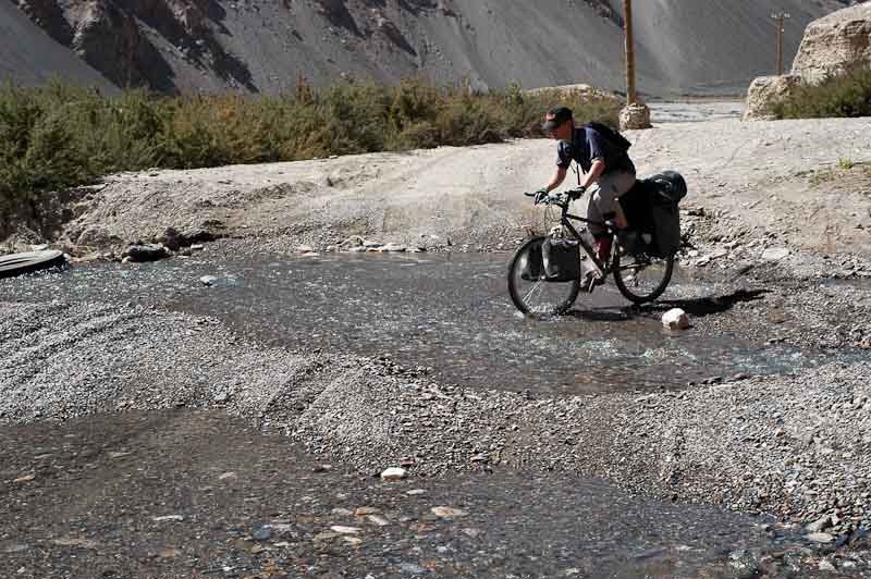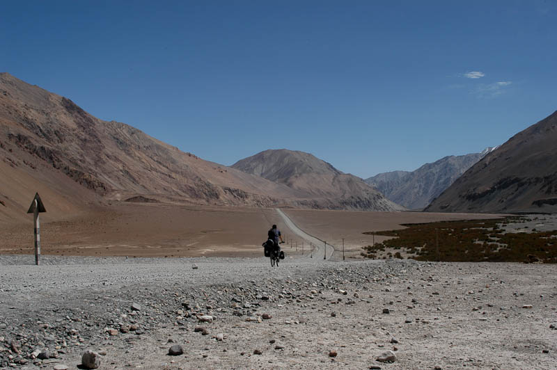 Und es geht weiter bergauf. Am zweiten Tag erreichen wir den ersten Pass (3270 m), von hier geht es in wilder Fahrt bergab auf 2500 m. Die nächste Ortschaft Kudi hat einen Kontrollposten des Militärs. Wir entscheiden uns für die sichere Variante und durchqueren diesen im Schutz der Dunkelheit morgens um 5 Uhr. Bemerkt werden wir nur von streunenden, kläffenden Kötern. Nach der Ortschaft geht es weiter bergauf. Die folgende Nacht verbringen wir unterhalb der Straße auf 4100 m. Der LKW Strom lässt die ganze Nacht nicht nach. Nach dem hundertsten LKW schlafe ich endlich ein. Am nächsten Morgen sehen wir warum: an einer Baustelle wird die Straße wegen Teerarbeiten für eine Woche gesperrt. In der nächsten Woche haben wir die Strecke für uns allein. Der lokale Verkehr beschränkt sich auf zwei bis drei LKW pro Tag. Radfahrerherz, was willst Du mehr?